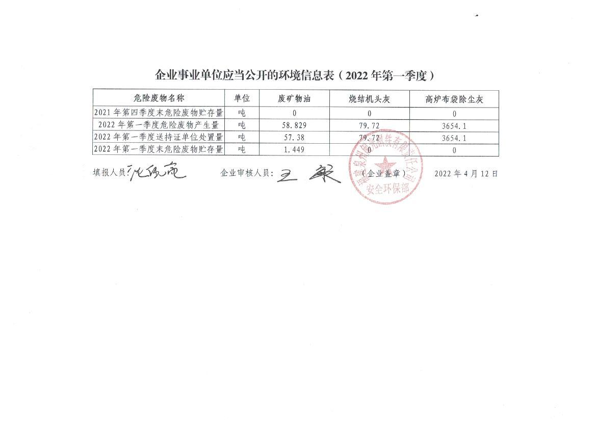 企業(yè)事業(yè)單位應(yīng)當(dāng)公開的環(huán)境信息表(2022年度第一季度)