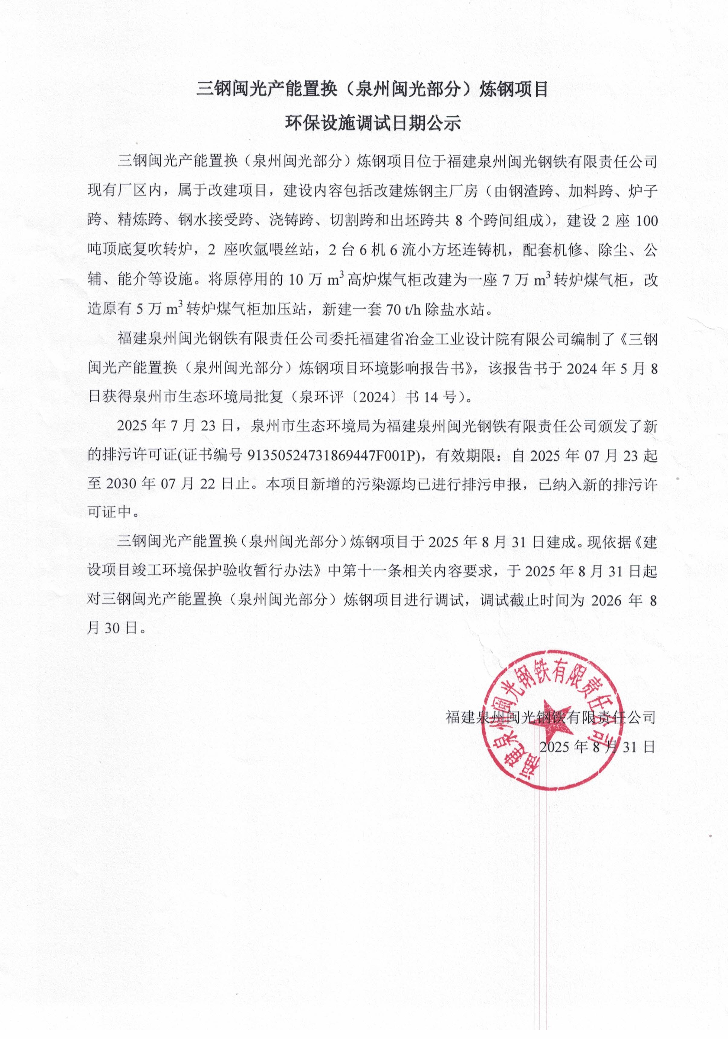 三鋼閩光產(chǎn)能置換(泉州閩光部分)煉鋼項(xiàng)目環(huán)保設(shè)施調(diào)試日期公示