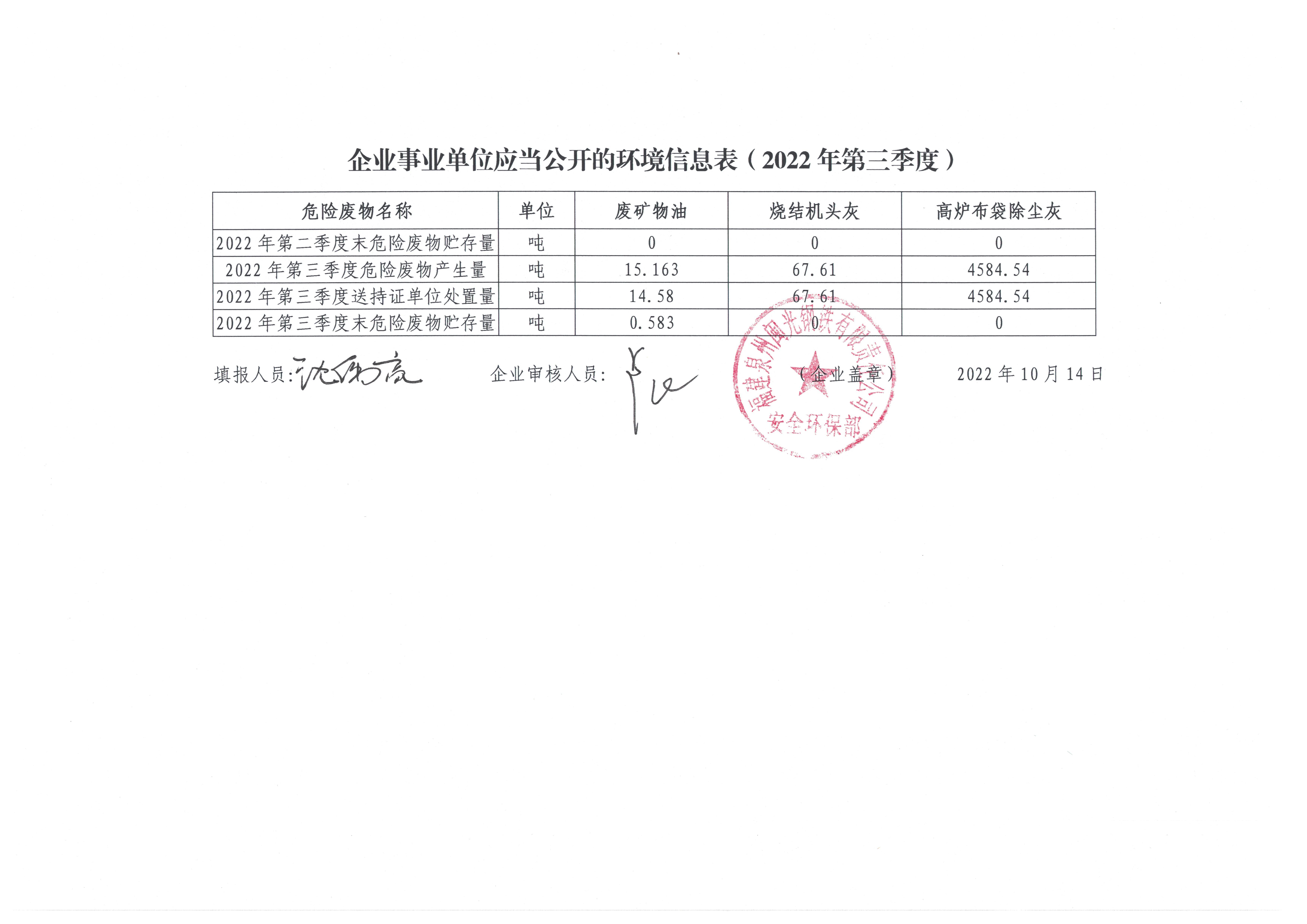 企業(yè)事業(yè)單位應當公開的環(huán)境信息表(2022年度第三季度)